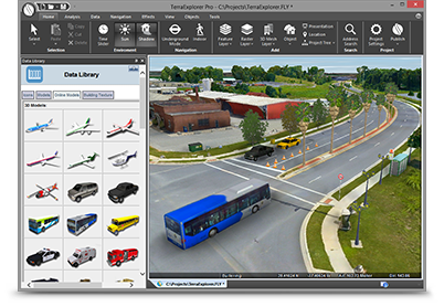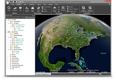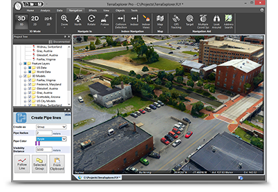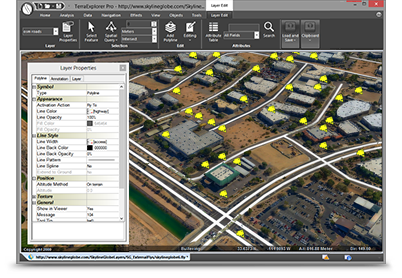 Users can navigate through and perform advanced terrain analysis and basic editing of high resolution 3D world environments created by fusing aerial and satellite photography, terrain elevation data and other 2D and 3D information layers.